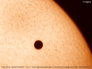 Ralf Vandebergh 6-inch refractor f/8 Sony TRV740 camcorder June 8, 2004, 11:11:37 UT The Netherlands | Venus Transit - H-alpha Image [1000 x 748 pix - 207k]