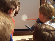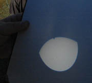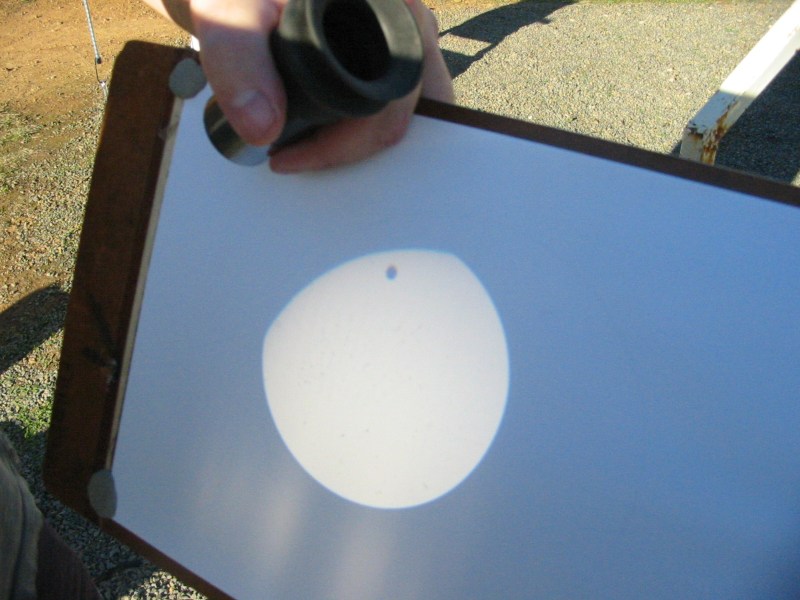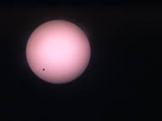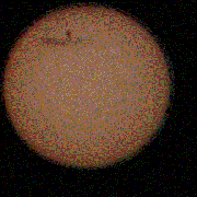 Fraser, Michael and Alex Farrell 30mm f/23 refractor (35-year old optics) Handheld digital camera Projected image ["A sunny winter afternoon for the transit at Penwortham (33° 55' S 138° 38' E), so a group of us got to see the first ~2.5 hours of transit before the Sun set. Several telescopes, filters, welding glass, eclipse shades etc were used successfully. Including our re-enactment of Horrocks & Crabtree in 1639 - a cheap refractor stopped down to 30 mm, with Barlow lens & Huygens eyepiece, projecting an image onto paper. The closest we could get to a typical early 17th century telescope."] June 8, 2004 Penwortham, Australia | Venus Transit from Australia [Animated GIF- 400 x 400 pix - 943k]