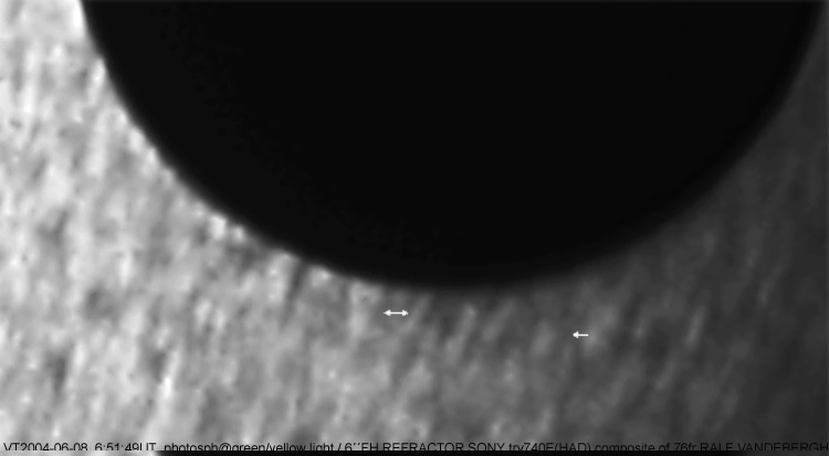 Ralph Vandebergh 6-inch refractor Sony TRV740E HI-8 [Composite of 76 frames] June 8, 2004, 06:51:49 UT The Netherlands | Venus and Photospheric Granules (Detail) [750 x 413 - 84k ]