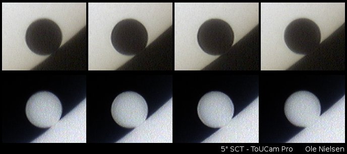 Ole Nielsen 125mm Schmidt-Cassegrain telescope f/10 TouCam Pro webcam June 8, 2004 Rijswijk, The Netherlands More information at this site | Venus Atmosphere After Third Contact [688 x 306 pix - 34k]