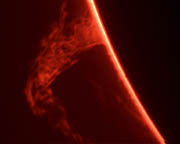 Ulrich Schmidbauer 90/1300mm refractor Prominence Viewer (homebuilt) and 0.1nm H-alpha filter DCR-TRV50E camcorder [Composite of best frames from 15 sec video clip] June 8, 2004, 05:17 UT Munich, Germany More information at this site |