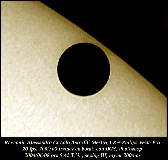 Alessandro Ravagnin Circolo Astrofili Mestre Celestron-8 Philips Vesta 20 fps Composite of 200/300 frames June 8, 2004, 05:42 UT Mestre, Italy | Venus Transit - Composite [1500 x 1200 pix - 184k]