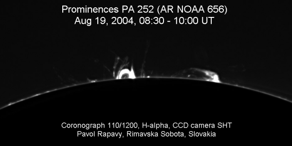 Pavel Rapavy 110/1200m Coronograph + H-alpha filter CCD camera SHT [Related to Solar Active region NOAA 656] August 19, 2004, 08:30 - 10:00 UT Rimavska Sobota, Slovakia |