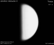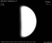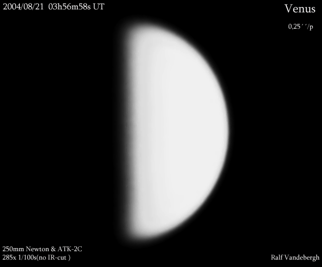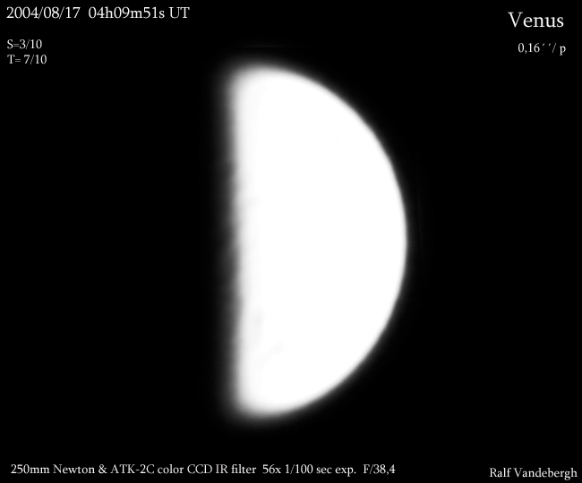 Ralph Vandebergh 250mm Newtonian telescope; f/38.4 ATC-2C Colour CCD IR filter Composite of 56 frames at 1/100 sec [Through turbulent atmopshere] August 17, 2004, 04:19:51 UT The Netherlands | "Half-Venus" in the Morning Sky [650 x 540 - 68k]