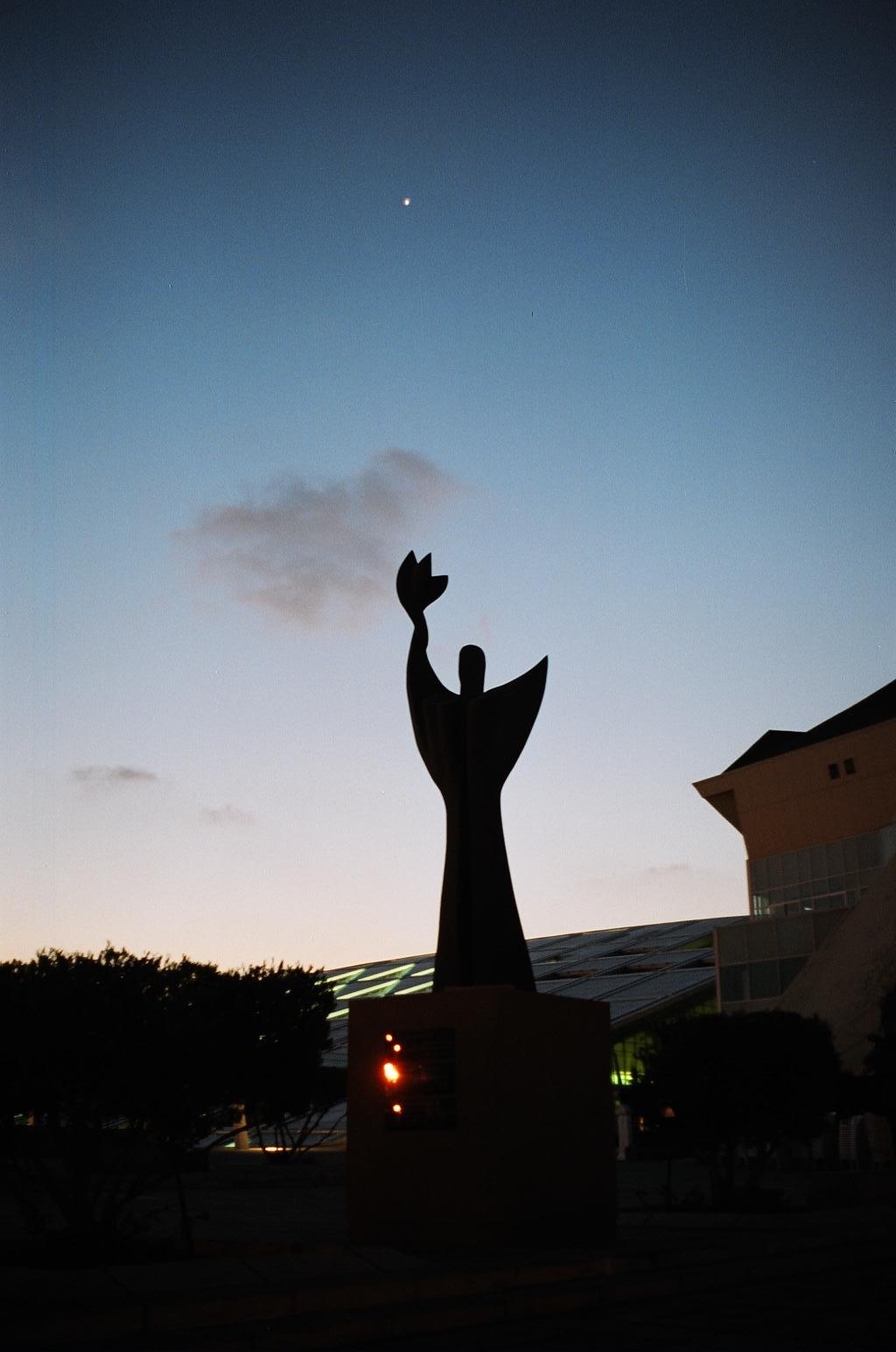 Aymen Ibrahem Bibliotheca Alexandrina Practica with Zenith 2.8/37mm Fujicolor 400; 1/2 sec [Bibliotheca Alexandrina and the Prometheus statue in the foreground] September 8, 2004