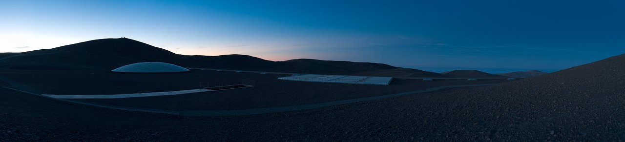 In the very early morning light, some architectural features of the Residencia stand out. Located at the foot of two hills, the rooftop blends into the surrounding landscape, whereas the skylights of the interior gardens remain visible.