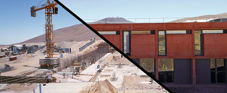 В фотовыпуске этого месяца, сделанном в обсерватории ESO Паранал в чилийской пустыне Атакама, мы сравниваем шумную стройплощадку ноября 1999 года с конечным результатом этого строительства на сегодня: гостевым домом для приезжающих в обсерваторию, известным под названием отеля «Резиденция» на Паранале. Представьте себе произошедшие за это время перемены: стук молотков, гудение дрелей, шум моторов тракторов и подъемных кранов сменились мирной тишиной и покоем уединенного здания посреди пустыни. Построенное с использованием природных материалов и естественных цветов, вписанное в существовавшее естественным образом углубление в горном ландшафте, законченное здание отеля идеально сочетается с окружающим пейзажем.