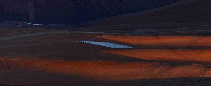 На переднем плане видны скопления белых образований -- пенитентов. Пенитенты представляют собой любопытное природное явление, которое встречается в высокогорных районах, обычно, выше 4000 м над уровнем моря. Эти тонкие пики затвердевшего снега или льда, острия которых направлены к Солнцу, достигают высоты от нескольких сантиметров до нескольких метров.