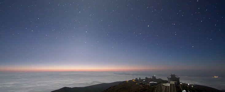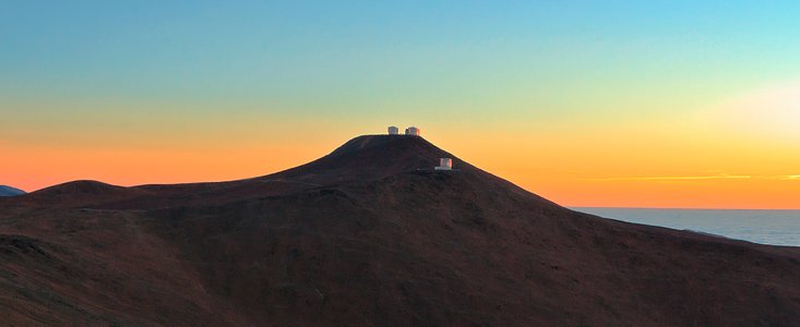 Эта местность предоставляет астрономам, может быть, лучшие на нашей планете условия для наблюдений ночного неба. В правой части этой 360-градусной панорамы, в направлении, в котором лежит Тихий океан, видно заходящее Солнце, от которого ложатся длинные тени гор. Слева на небе поблескивает Луна. Скоро начнутся ночные наблюдения.