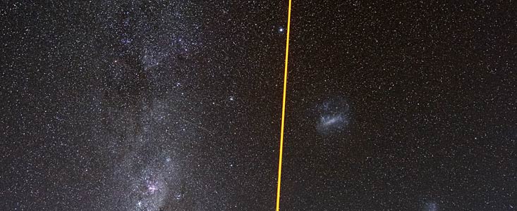 Лазер Йепуна – не единственное, что ярко сияет на небе. Слева и справа от лазерного луча мы видим Большое и Малое Магеллановы Облака, соответственно. Эти соседние с нашей иррегулярные карликовые галактики хорошо заметны на небе южного полушария, их можно легко наблюдать невооруженным глазом. Яркая звезда слева от Большого Магелланова Облака – Канопус, самая яркая звезда в созвездии Киля (Carina); вверху справа на снимке – Ахернар, ярчайшая звезда в созвездии Эридана (Eridanus).