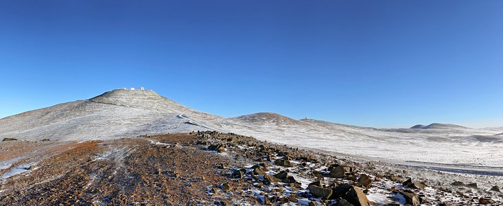 Потусторонняя красота чилийской пустыни Атакама в месте установки Очень Большого Телескопа ESO (Very Large Telescope -- VLT) простирается до самого горизонта на этом панорамном снимке. На вершине Серро Параналь (Cerro Paranal), самого высокого пика в центре снимка, находятся четыре гигантских Базовых Телескопа (Unit Telescopes), входящих в систему VLT; диаметр главного зеркала у каждого из них составляет 8.2 метра. На вершине горы слева от Серро Параналь – обзорный телескоп VISTA. Этот 4.1-метровый телескоп просматривает широкие полосы неба в поисках интересных целей, которые VLT и другие наземные и космические телескопы затем изучают в деталях.