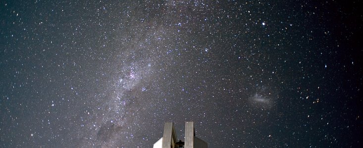 Слева на фотографии на крыше здания обсерватории виден флагшток с ветроуказателем. Слева от него – яркое пятно Малого Магелланова Облака, галактики, соседней с Млечным Путем. Дальше вправо, в плоскости Млечного Пути, светящаяся красноватым светом Туманность Киля (Carina Nebula). Над ней – темная туманность Угольный Мешок (Coalsack Nebula), рядом с ним Южный Крест, а еще чуть повыше две ярких звезды – альфа и бета Центавра. Четыре больших здания – башни 8.2-метровых Базовых Телескопов (Unit Telescopes -- UT), составляющих VLT. Между двумя UT в правой части снимка – меньшего размера башня Обзорного Телескопа VLT Survey Telescope. Еще правее над самым горизонтом сияет Венера.