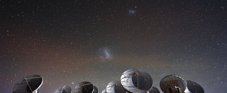 Многочисленные гигантские антенны занимают весь центр изображения. Когда строительство телескопа ALMA будет завершено, он будет состоять в общей сложности из 54-х таких 12-метровых тарелок. Над решеткой радиотелескопов великолепным фоном нависает арка Млечного Пути. Когда снималась эта панорама, Луна находилась на небе вблизи центра Млечного Пути и антенны были залиты ее призрачным светом. Большое и Малое Магеллановы Облака, крупнейшие из окружающих Млечный Путь карликовых галактик-спутников, выглядят двумя яркими пятнами на небе слева. На редкость яркий метеорный след сверкает рядом с Малым Магеллановым Облаком.