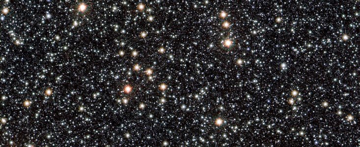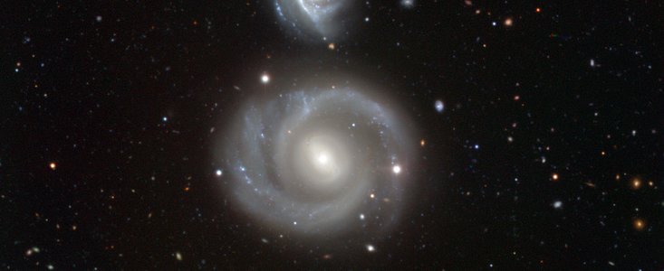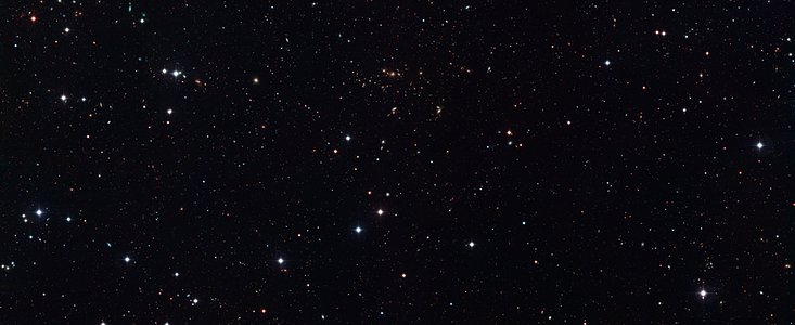 На этом «глубоком» снимке – одно из галактических сверхскоплений, то есть гигантское скопление скоплений галактик. Это сверхскопление, называемое Abell 901/902, включает в себя три отдельных больших скопления и множество «волокон», тоже состоящих из галактик, что типично для таких сверхструктур. Одно из больших скоплений, Abell 901a, видно вверху и справа от выделяющейся на переднем плане красной звезды в центральной части снимка. Другое скопление, Abell 901b, правее и немного ниже Abell 901a. И наконец, скопление Abell 902 расположено непосредственно под красной звездой.