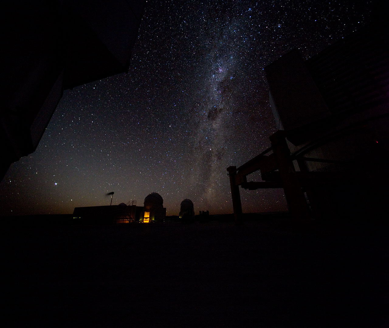 The Milky Way gleams over Paranal, site of ESO’s Very Large Telescope. Two of the 1.8-metre Auxiliary Telescopes with their round covers are visible in the distance, as well as the Very Large Telescope Interferometer laboratory. Looming in the foreground are two of the 8.2‑metre Unit Telescopes.