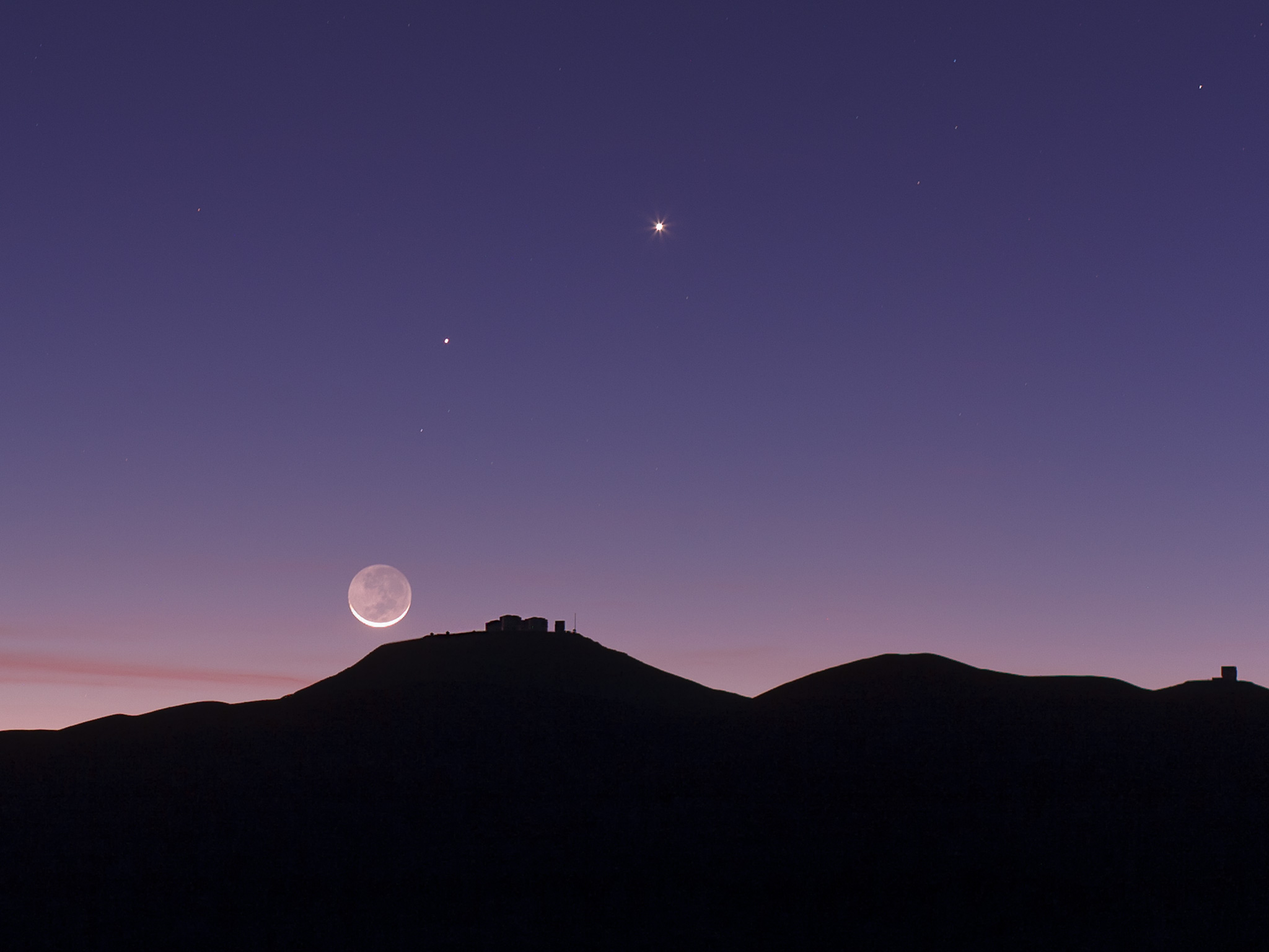 Bilden visar en tunn månskära som går ner över ESO:s Paranalobservatorium i Chile. Förutom månskäran syns även resten av månens skiva. Fenomenet kallas jordsken. Det uppstår då solens ljus reflekteras av jorden och lyser upp månens yta. Genom att observera jordsken kan astronomer studera ljuset som reflekteras av jorden, som om den var en exoplanet, och leta efter tecken på liv.