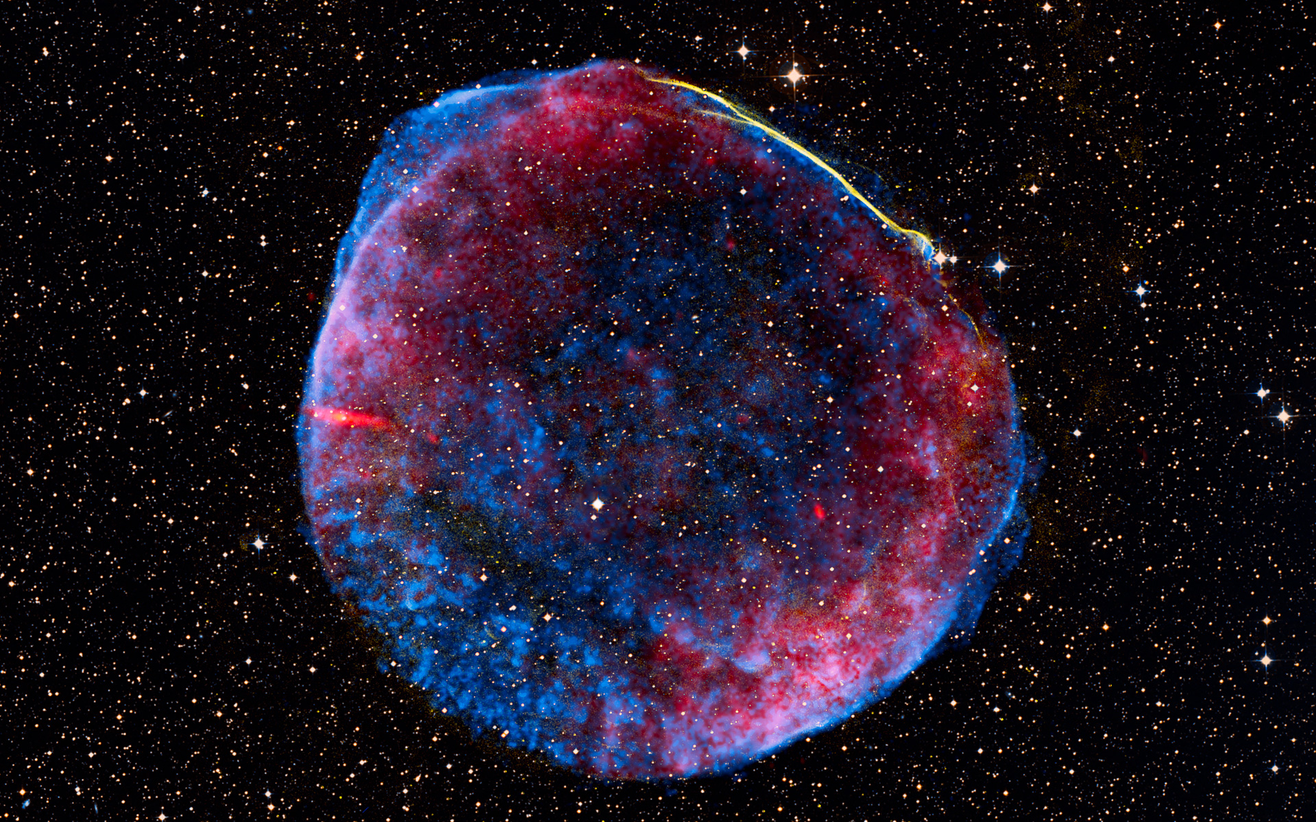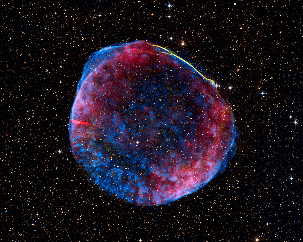 Denna märkliga och spännande bilden skapades från bilder tagna med olika teleskop i rymden och på marken, och visar resterna av supernovan SN 1006 i radio (rött), röntgenstrålning (blått) och synligt ljus (gult).