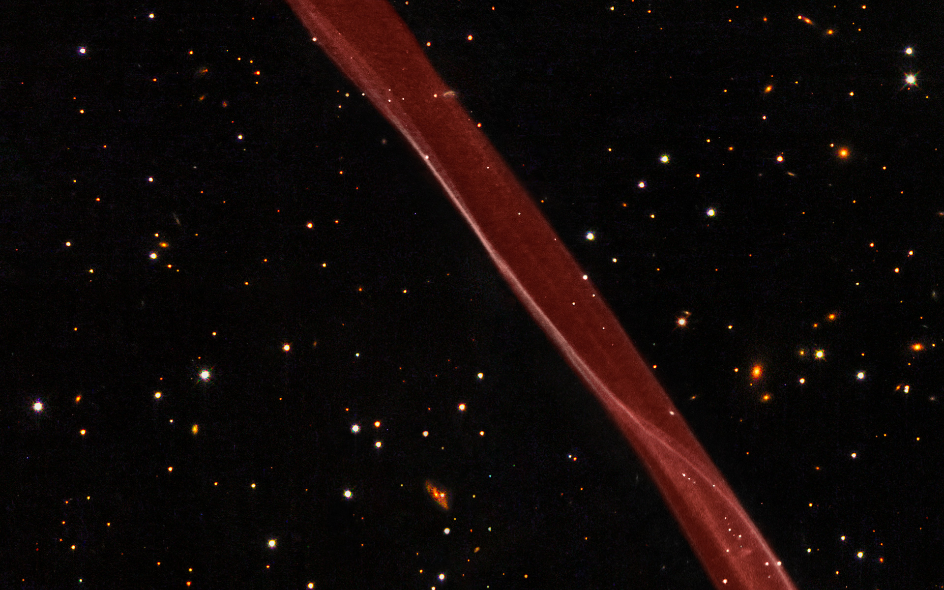 Den här bilden är en sammansättningen av ljus från vätgas tagen med Hubbleteleskopets Advanced Camera for Surveys i februari 2006 och observationer med Wide Field Planetary Camera 2 i blått, gulgrönt och infrarött ljus tagna i april 2008. Supernovarestens röda färg beror på att den framträder bra bara i bilden tagen i ljuset från vätgas, som här visas i rött.