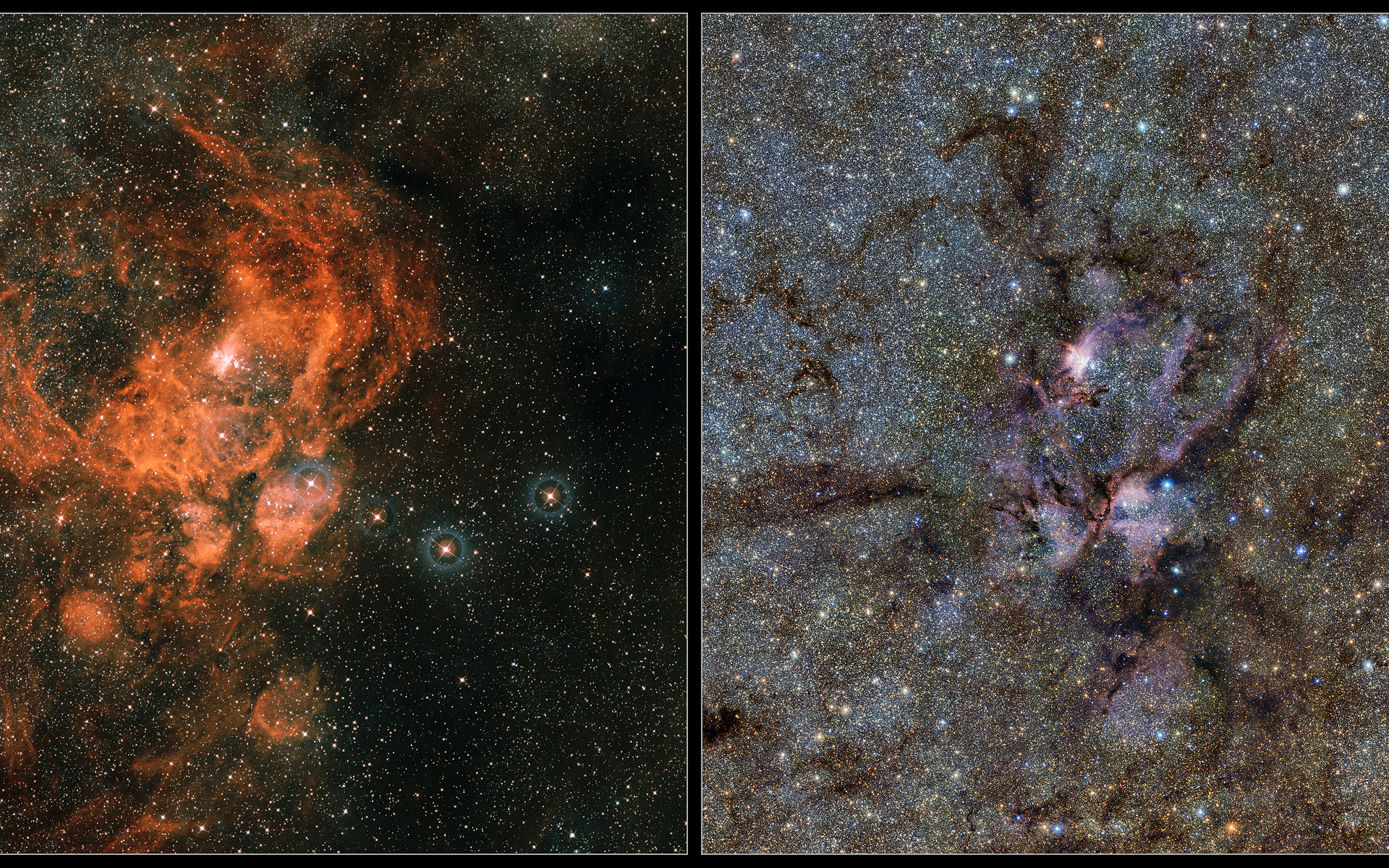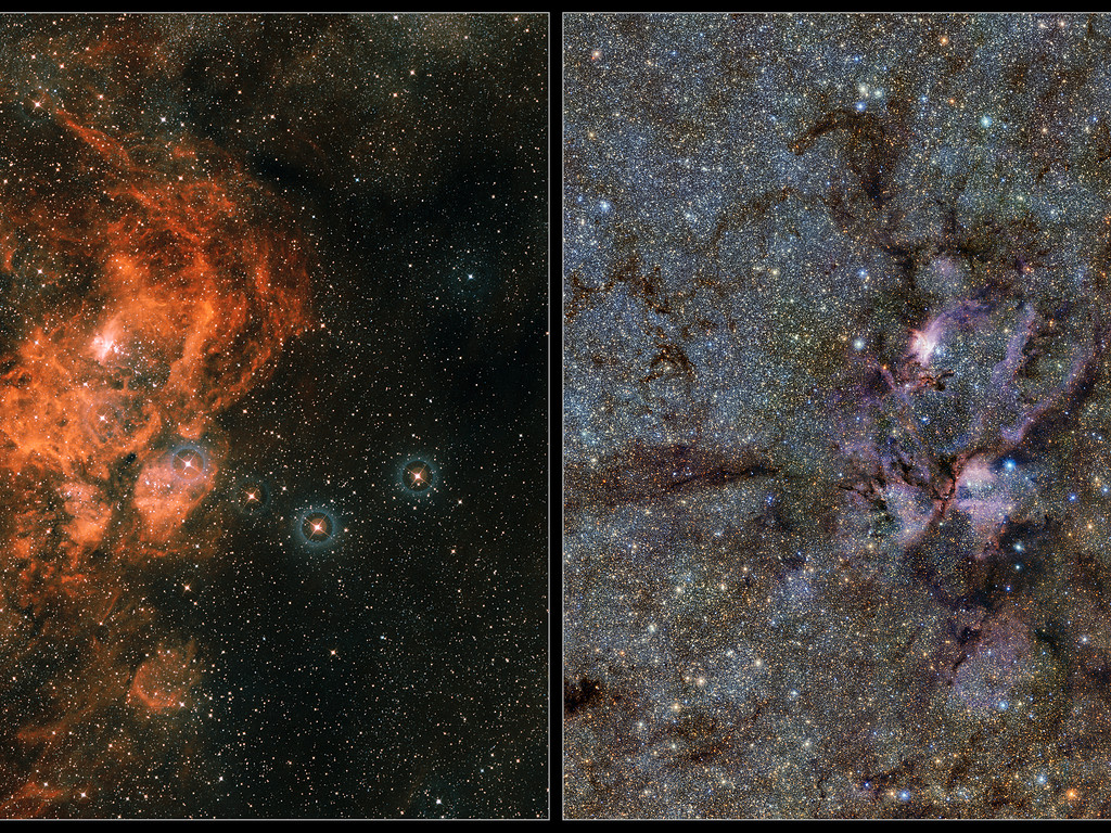 I den här bilden jämförs bilder tagna i infrarött och synligt ljus av Hummernebulosan (NGC 6357). Bilden tagen i synligt ljus (till vänster) skapades från bilder från Digitized sky survey 2. Den infraröda bilden (till höger) togs av teleskopet VISTA vid ESO:s Paranalobservatorium. I infrarött ljus blir stoftet, som skymmer många stjärnor i synligt ljus, nästan genomskinligt, och avslöjar ett helt gäng nya stjärnor som annars är osynliga.