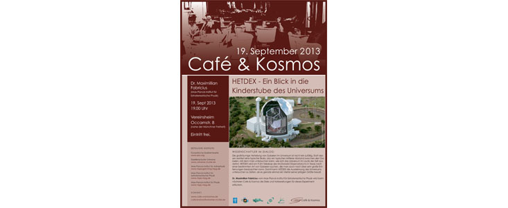 At the next Café & Kosmos evening on Thursday 19 September 2013 we will join Dr. Maximilian Fabricius (Max Planck Institute for Extraterrestrial Physics) for a discussion about the HETDEX (Hobby-Eberly Telescope Dark Energy Experiment) project at the McDonald Observatory in Texas.