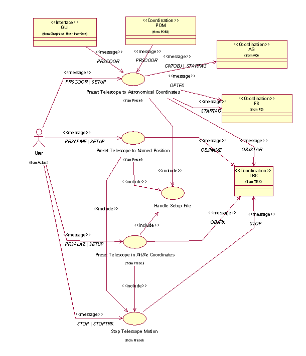 Description: The Presetting package takes care of requests to move the telescope to a new object, specified through its celestial coordinates (right ascension and declination), or to a new fixed position, expressed in local telescope coordinates (altitude and azimuth) or by means of predefined keywords (like zenith). Only in the first case the tracking will start automatically just after the preset procedure has completed. A preset request can be delivered either by specifying in a command the value of the required presetting parameters or by passing a pointer to a setup file, which holds the complete information to configure and position the telescope.