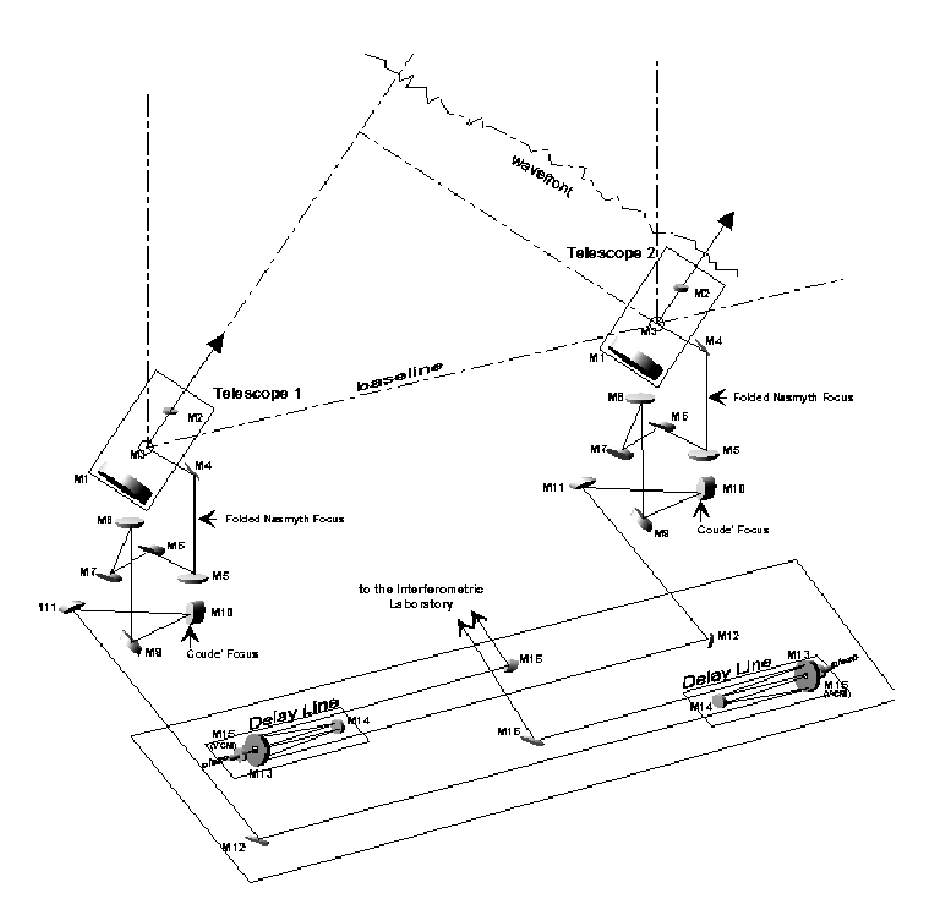 Figure 2 in this chapter, includes:The light collected by the primary mirror M1 of each observing telescope is directed through the Nasmyth focus down to the Coudé Station by means of the Coudé Optical Train (M4...M8). The Coudé Relay Optics (M9...M11) injects the light beam into the interferometric tunnel. The Transfer Optics (M12, M16) redirects the collimated light beam towards the assigned Delay Line, where it is retroreflected, and feeds the entrance of the Imaging Beam Combiner or directly a VLTI Instrument.