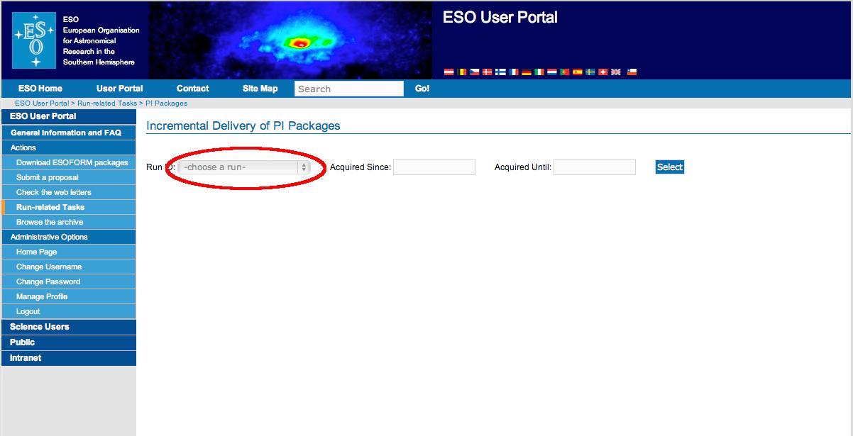 Once you have logged in using your User Portal credentials, you are presented with a pull down menu that lets you choose one of your active runs for which the PI Pack is available (for obvious privacy reasons, only your runs are displayed).