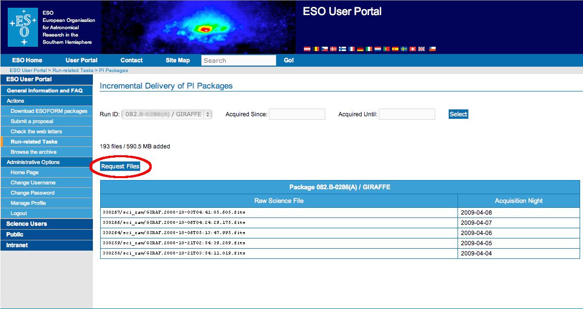 You can, then, specify a time interval in which the data were acquired and press the "Select" button on the right to run the query. Not entering any dates will return all the available data. Please note that, for the sake of clarity, only the raw science files will be shown in return, not the complete content of the package that can easily amount to several hundreds of files (raw and master calibrations, reduced science, ancillary files, etc.).