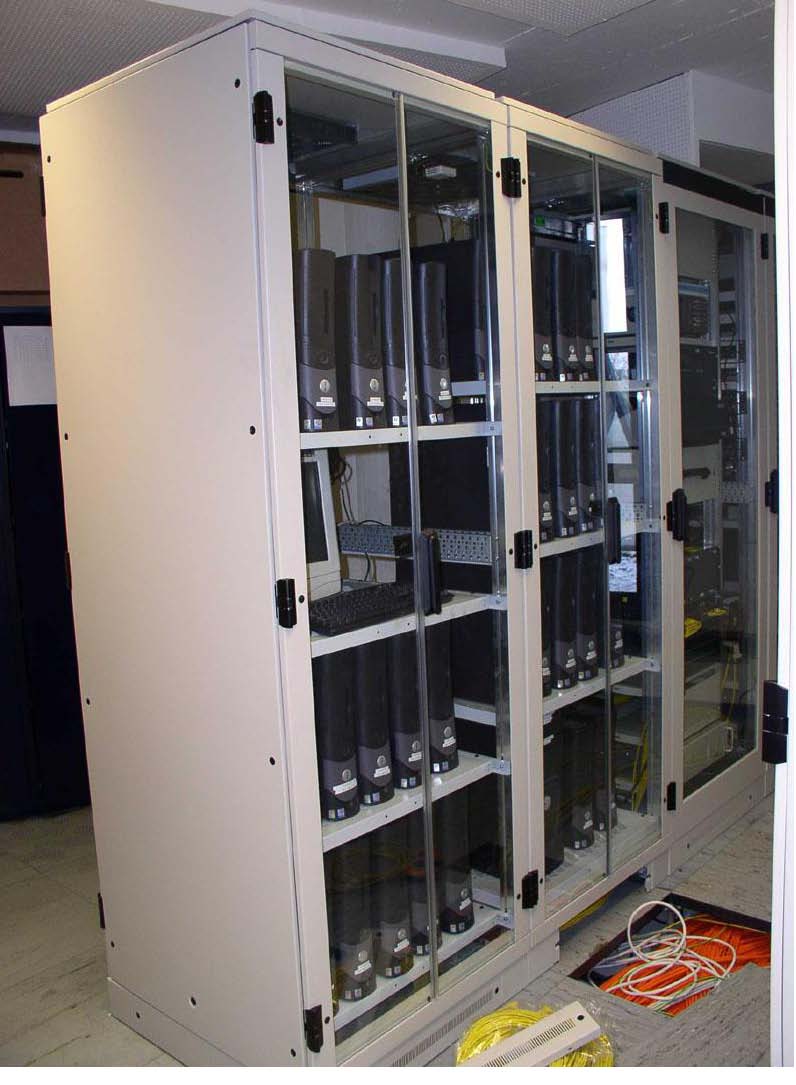 Figure 1. Picture showing the cluster of PCs, and the cabinets containing them, in which cool air is circulated throughfans. The picture was taken when the cluster was not yet complete. |