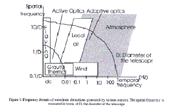 In practice, however, both atmospheric and telescope errors (Fig.1) distort the spherical wavefront, creating phase errors in the image-forming ray paths. Even at the best sites, ground-based telescopes observing at visible wavelengths cannot, because of atmospheric turbulence alone, achieve an angular resolution better than telescopes of 10- to 20-cm diameter. For a 4-m telescope, atmospheric distortion degrades the spatial resolution by more than one order of magnitude compared with the diffraction limit, and the intensity at the center of the star image is lowered by a factor of 100 or more.The cause is random spatial and temporal wavefront perturbations inducedby turbulence in various layers of the atmosphere; one of the principal reasons for flying the Hubble Space Telescope was to avoid this image smearing. In addition, image quality is affected by permanent manufacturing errors and by long time scale-wavefront aberrations introduced by mechanical,thermal, and optical effects in the telescope, such as defocusing, decentering, or mirror deformations generated by their supporting devices.