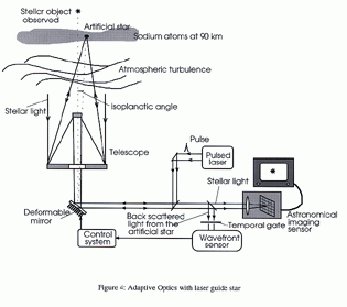 The most promising way to overcome the isoplanatic angle limitation is the use of artificial reference stars, also referred to as laser guide stars (LGS) (Fig. 4). These are patches of light created by the back-scattering of pulsed laser light by sodium atoms in the high mesosphere or by molecules and particles located in the low stratosphere. The laser beam is focused at an altitude of about 90 km in the first case (Sodium resonance) and 10 to 20 km in the second case (Rayleigh diffusion). Such an artificial reference star can be created as close to the astronomical target as desired, and a wavefront sensor measuring the scattered laser light is used to correct the wavefront aberrations on the target object.
