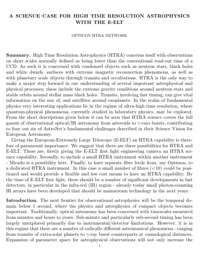 The Science Case for the High Time Resolution Astrophysics with the E-ELT, a white paper from the Opticon HTRA network (May 2010).