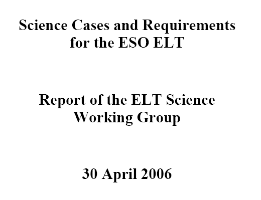 The documents below contain detailed descriptions of the science case for a European ELT. The fact that several such documents exist reflects to some extent the evolution of the E-ELT concept from a 50-100m telescope to a 30-60m telescope, which required some revision of the original science case.