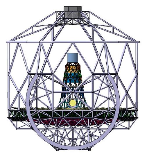 Altitude structureThe altitude structure (see Figure 3) hosts the telescope optics. It is made of hollow beams and is estimated to weigh approximately 1500 t with the hosted units. The major challenges that have been addressed in the design are the need to keep the primary mirror segments within a reasonable range from their prescribed locations and the need to minimize the deflections of the secondary mirror. Central towerAs shown in Figure 3, the large central obstruction of the optical design also provides ample room for the erection of a central tower (see also Figure 4). This tower supports M3, M4 and M5, together to the Atmospheric dispersion compensator (ADC) and the adaptive optics calibration unit (CU). The CU creates artificial sources at the side of the central tower and projects them on a small mirror positioned close to M4. An optomechanical relay system inserts the source light beam inside the telescope train when the CU is in operation. |