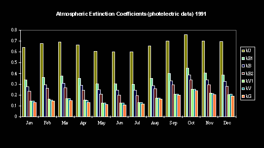You can see the Atmospheric Extinction Coefficients at La Silla, determined by using a two-channel photoelectric photometer, through this link map.