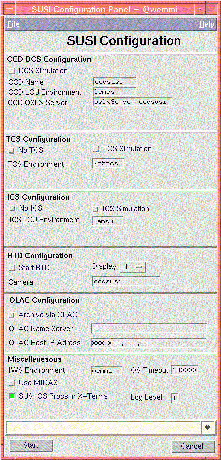 Selecting SUSI will produce the Instrument Configuration panel that allows you to configure how you wish to run the instrument (i.e. the degree of simulation; whether you wish to use the PCO on the instrument workstation etc. etc.). This panel will disappear when SUSI2 starts up.