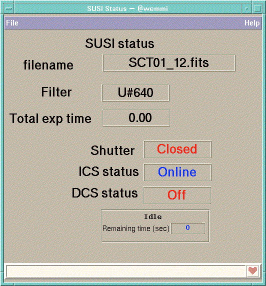 The SUSI2 ccd is monitored using the SUSI2 real time display (rtd) . Although you can start any real time display (rtd) and connect to SUSI2, certain acquisition templates require that the real time display write a file. Therefore you should start the SUSI2 camera real time display. This is normally done from the pop-up menu (on vue). More detailed information is given in CCD Software section.
