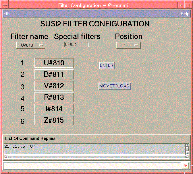 By selecting the position you wish to configure and clicking on MOVETOLOAD the filter wheel will position the requested position into the load location. You may then change the filter in that location. If the filter is a standard one then its name will also appear under the option menu with the label filter name. Once selected there the name will also appear in the entry field for special filters. By clicking on ENTER you can update the database for that filter location with the name selected. Filter names must not contain spaces and must be the same in BOB and the SUSI2 OS.
