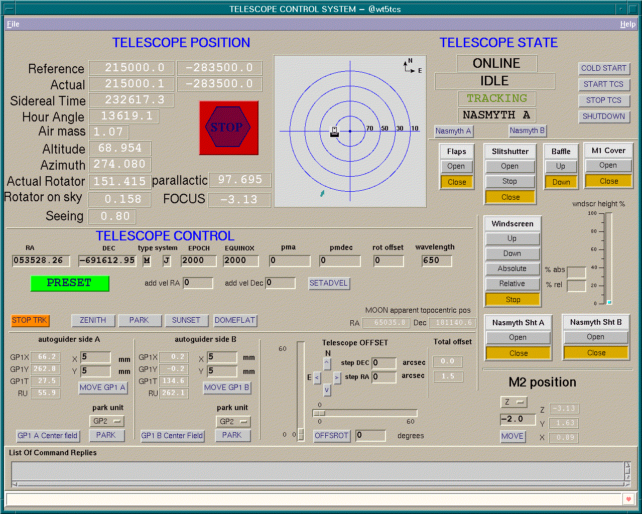 Each subsystem of the TCS has a state and a sub state. The basic states are: LOADED, STANDBY and ONLINE. The sub states depend on the module but for example the tracking LCUs can have sub states TRACKING, PRESETING, ERROR and others.