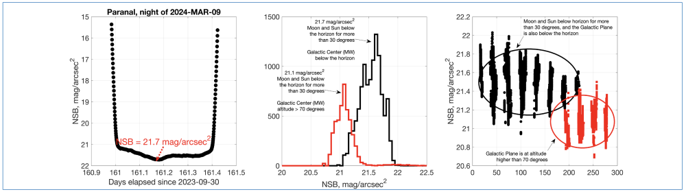 The NSB has been operating at Paranal since October 15th, 2023. Figure 3 shows the natural sky brightness at zenith for a typical night with no Moon (2024-03-09) in units of mag/arcsec^2 and V spectral band. The figure also shows the histogram of the NSB, for periods when the Sun and Moon are at least 30 degrees below the horizon and for two conditions of the visibility of the Galactic plane, one when the center of the MW galactic plane is below the horizon and one for when the center of the GC is higher than 70 degrees elevation.