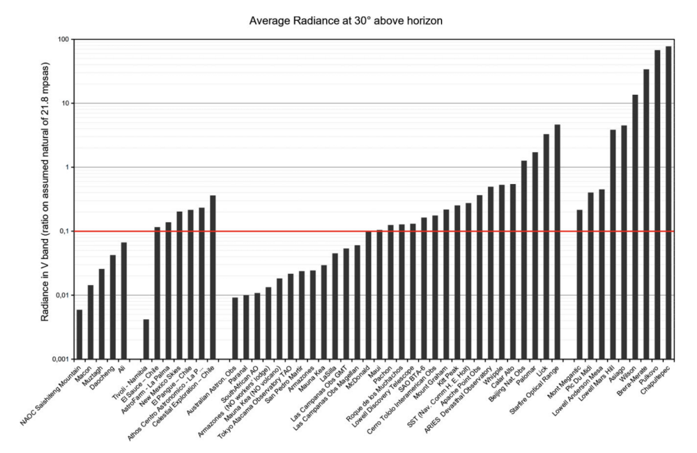 The Paranal/Armazones area is among one of the astronomical observatory sites less affected by Artificial Light Pollution at Night (ALAN), reaching about 1% above the natural sky brightness condition [3], as is shown in Figure 4.