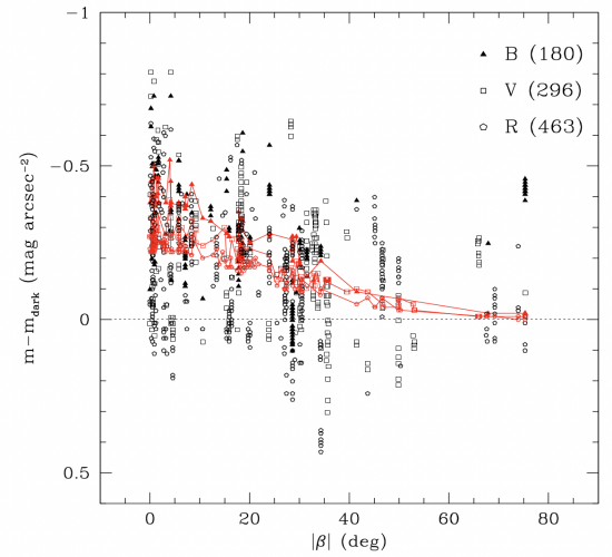 The sky brightness dependency on the ecliptic latitude is shown in the figure below [1]. The data shows deviations from the average sky brightness included in the Table above, for B, V, and R passbands, after applying the correction ΔmZL [1].