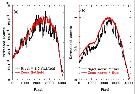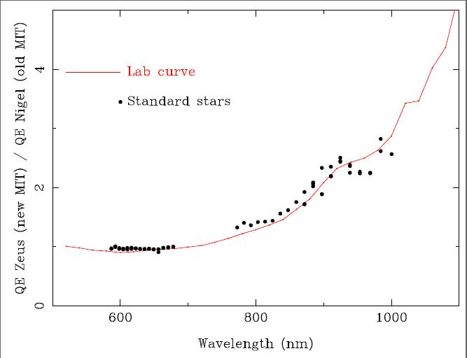 - Aug 26, 2009. The UVES red arm quantum efficiency ratio for the new/old MIT CCD is shown below (left panel) as derived in the lab and from standard stars. The EEV (bluer part of the red mosaic) is UNCHANGED. The MIT (redder part of the red mosaic) CCD "Nigel" was replaced with another MIT CCD "Zeus" in early July 2009 with superior Quantum Efficiency above 700-nm. The fringing is also much reduced;Plot (a) shows an extracted FLAMES-UVES flatfield order at about 900-nm with the Old CCD counts multiplied by 2.5 (same integration time). Plot(b) shows one normalised order of a stellar spectrum taken before and after the upgrade for standalone UVES.