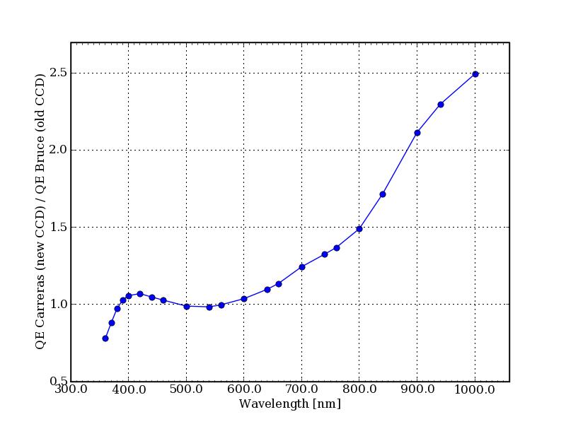 - March 1, 2008: The QE of the new detector to the existing one is shown below. A considerable improvement in the sensitivity is expected for wavelengths above 650nm.