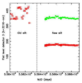 - Nov 22nd 2011: Flatfield levels before and after the replacement of the slit. The levels are now much more stable that may indicate some reduction in the frequency of calibrations in the future. The red points are the raw data, the green points are scaled points: