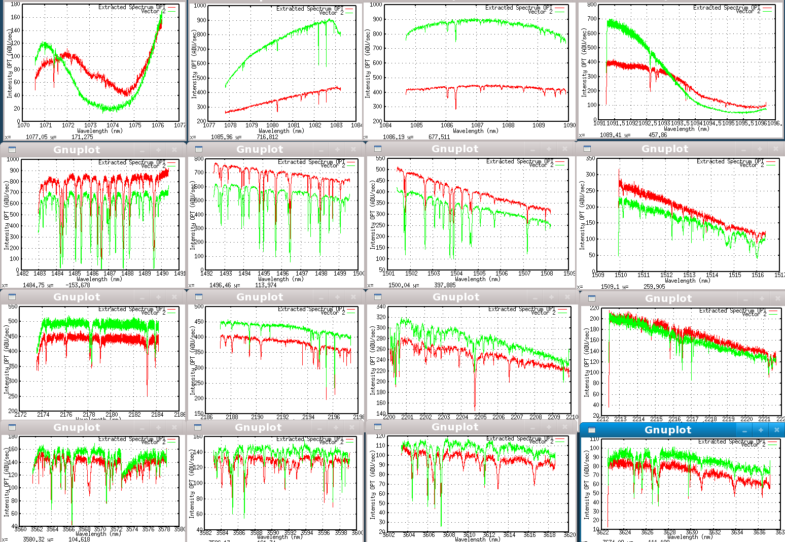 - Feb 25th 2012: Spectrophotometric standard Eta Hy before (red) and after (green) the slit intervention in September 2011. Detectors 1,2,3 and 4 are shown. At the very bluest settings detectors 1 and 4 are not useable although in any case they suffered from order contamination in pre-September 2011 observations. Reference wavelengths from top to bottom are 1087, 1504, 2205 and 3611-nm.