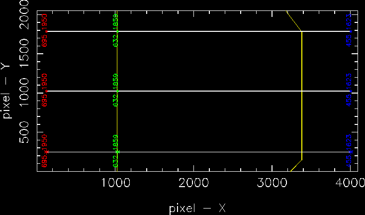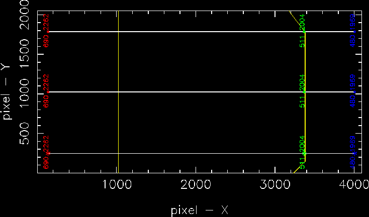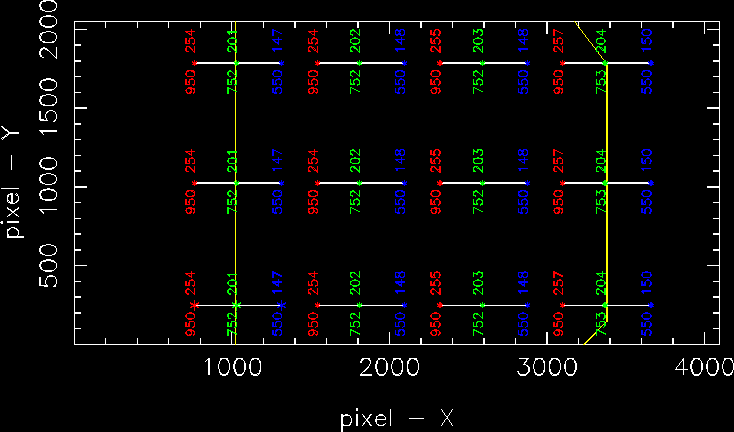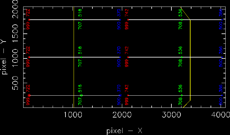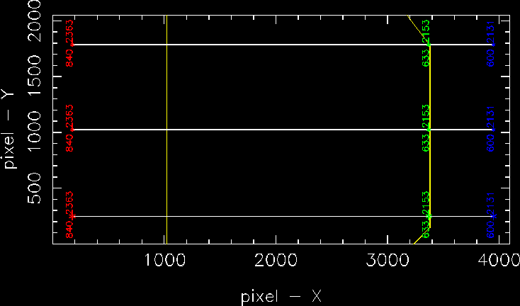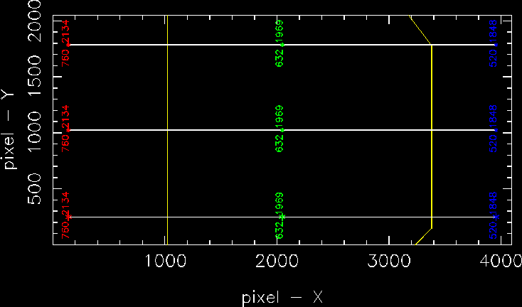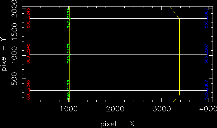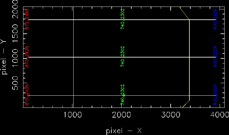 The following figures illustrate the MOS spectral formats.In yellow is indicated the edge of the imaging field of view.The start and end wavelengths are indicated (in nm) belowthe lines symbolizing the spectra, and the correspondingspectral resolutions are indicated above the lines. 3 layersof spectra are shown for illustration. The dots indicatethe object/slit positions.