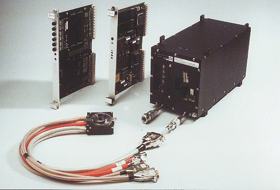 Top left in the photo is the VME interface module for the fiber-optic data link, top centre is the VME transputer module, and on the right is the control electronics box. In the foreground is the CCD head with cables and cooling hoses attached.