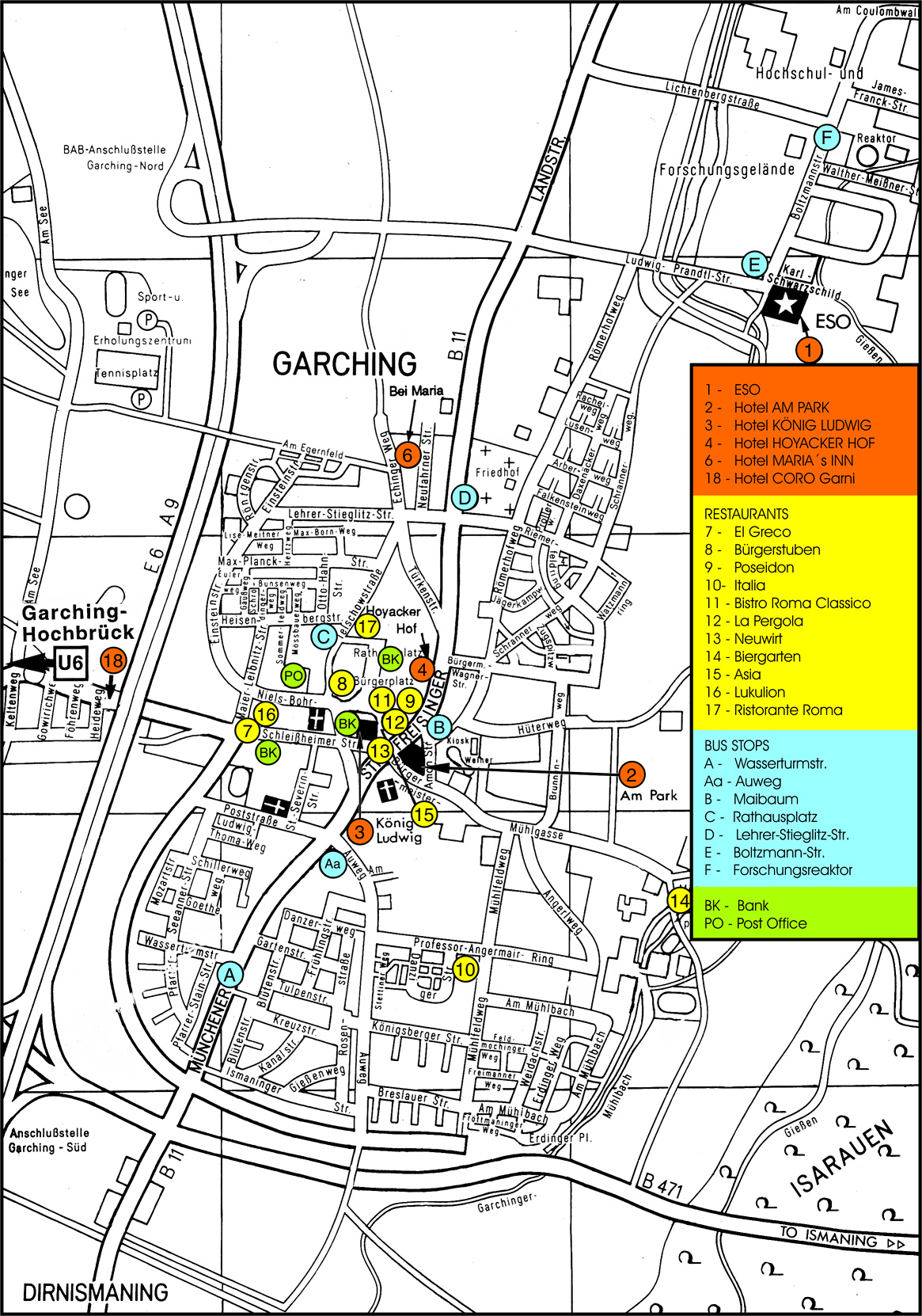 In the mornings and in the evenings of the workshop, there will be a bus transfer service between the hotels and ESO. Here is the timetable (pdf file). See the Overview Table for a summary of public transport possibilities between the airport, Garching, ESO, Ismaning and Munich city centre. Please note that it is not advisable to bring a car to the workshop venue because of limited parking space. More travel instructions can be found on the ESO Travel and Local Information pages. |