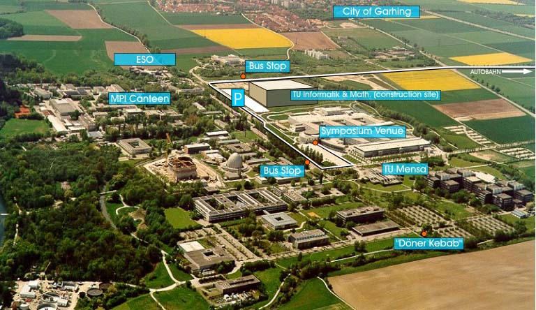 Since the large number of participants exceeds the seating capacity of the ESO Headquarters auditorium, the Symposium will be held in Garching in the Auditorium MW001 of the Faculty of Mechanical Engineering of the Technical University München (see the map and the overview of the Garching Research Institute area), and not at ESO Headquarters. The Auditorium is just a 10-minute walk away from ESO Headquarters. The address is Bolzmannstr. 15, Garching. |